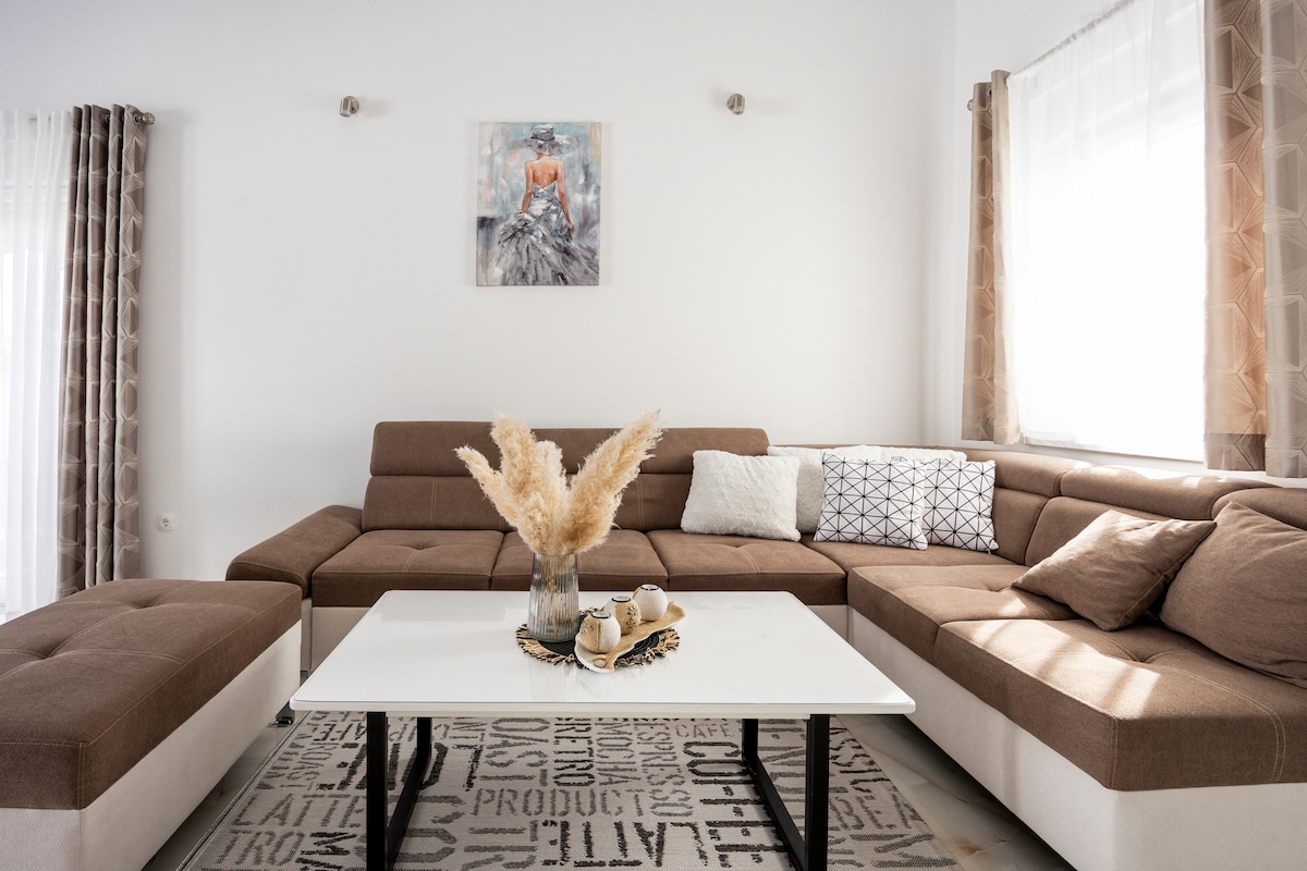 Welcome to our cozy apartment aptly named Nostalgija! Beautifully decorated by someone with a passion and an eye for detail, we tried to blend vintage charm, traditional ornaments, and elements of our heritage with modern retro-style amenities This newly furnished apartment features a spacious yard and garden, free parking, Wi-Fi, and air conditioning. It comfortably accommodates 4 guests + a child (we can provide a baby cot if needed).We are just 15-20 mins from the nearest beaches in the area!