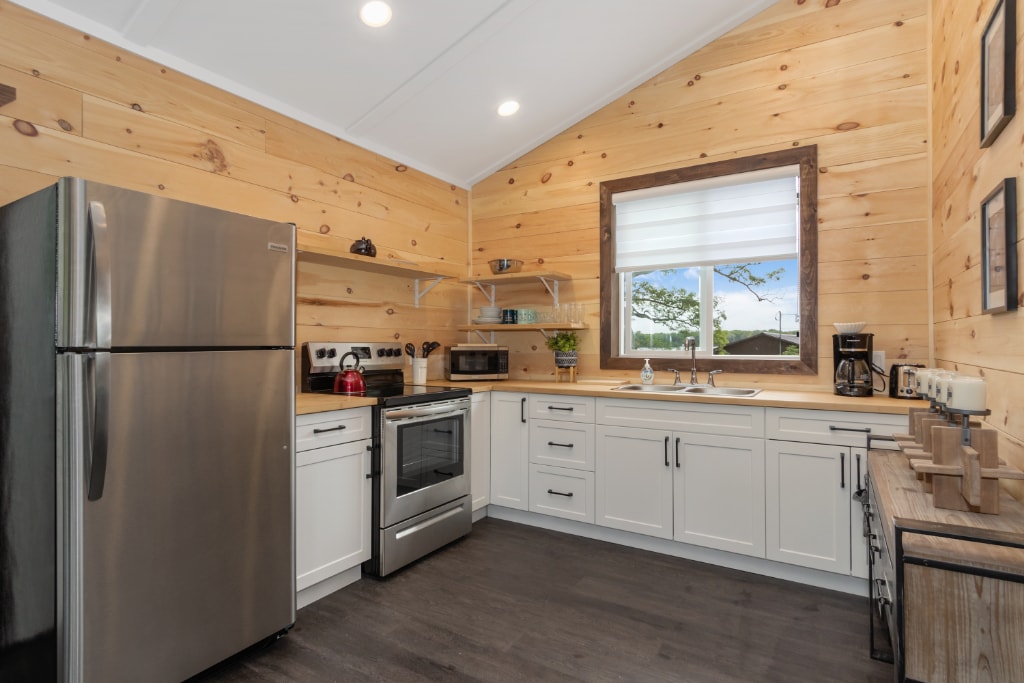 Stay at The Trace at Oak Lake Resort! This beautiful studio Lakefront accommodation is located at the point of the property, and is our signature cabin. Luxurious and incredibly private, this cabin features a rustic-modern open concept layout for living, sleeping and dining. Wake up in a soft king sized bed directly beside large floor-to-ceiling windows facing the lake. A spacious bathroom with tile shower, kitchen, dining and living area with flatscreen satellite tv and air conditioning.