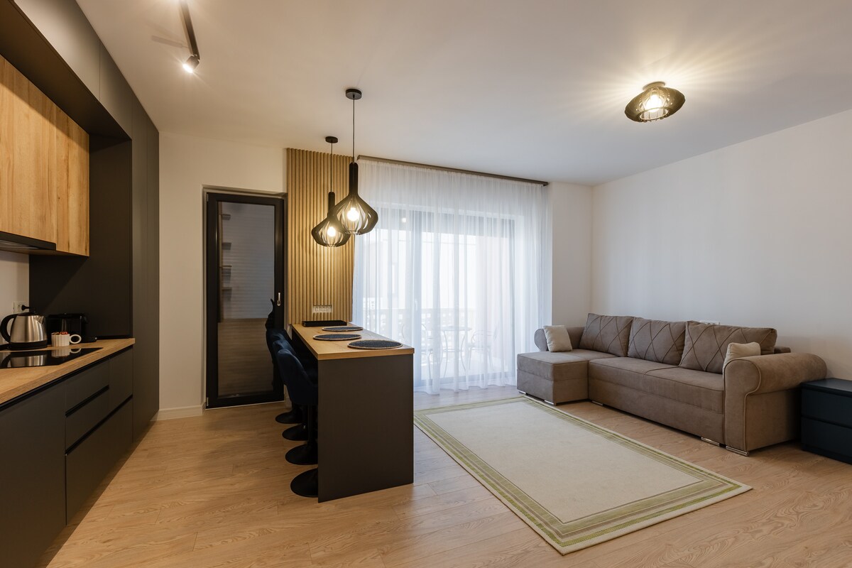 Apartament nou, luminos, cu design modern și parcare gratuită. Se poziționează la intrarea în Timișoara, în vecinătatea benzinăriei Esso. Apartamentul este dotat cu: -bucătărie complet utilată cu cele necesare: plită electrică, cuptor, mașină de spălat vase, frigider, aparat de cafea și veselă. -sufragerie open space în care oaspeții se pot bucura de un film, pe o canapea confortabilă, la un televizor Smart -dormitor cu pat matrimonial -baie cu cabină de duș și mașină de spălat rufe cu uscător.