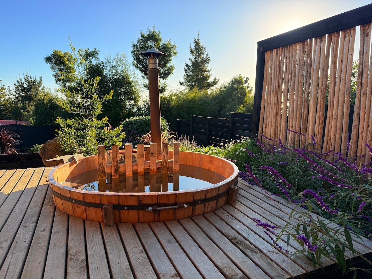 Wooden cabin with hot tub & Starlink, overlooking Cáhuil Lagoon and native forest. Secluded for silence, yet close to beaches, sightseeing, restaurants, and shops for all essentials. Features sunny terraces, skate ramp, fire pit, and gas/wood BBQs. Full cell signal and fast WiFi make it the perfect nature getaway. During winter season with rain a 4x4 car is recommended.