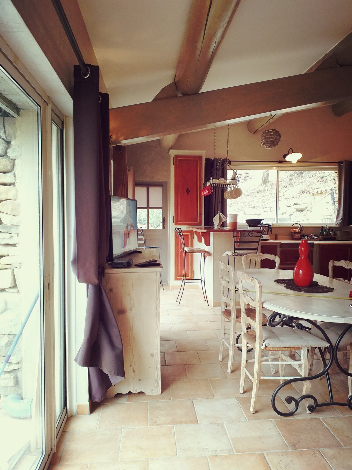 Large air-conditioned studio (door leading to kitchen area, then lounge and bedroom area with french door onto terrace. Well equipped kitchen, TV, internet, all linen included. Pool not shared at your disposal, not chlorinated and can be heated or cooled down. Car space under carport. Hosts speak fluent English. Ideal for touring Luberon villages, gorges du Verdon, Valensole lavender fields. 5 min to Manosque, 45 min to Aix and 50 min to Marseille airport.