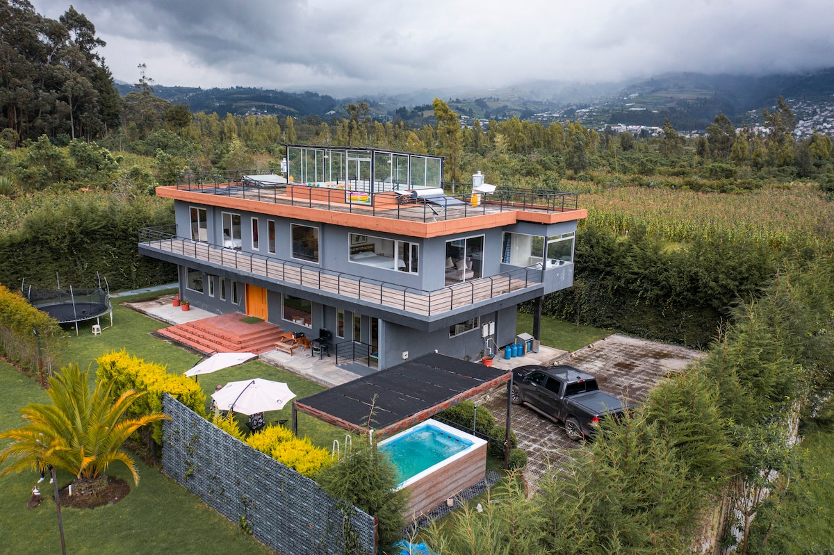 Nuestra casa del lago, fuciona el diseño industrial con calidez, madera y ladrillo, y brinda un descanso perfecto y base ideal para conocer la encantadora zona de Otavalo. Estamos a 20 min. del Mercado de los Ponchos, 50 minutos de las Lagunas de Mojanda, 20 min. de Cayambe, 40 min. de Cotacachi, etc Disfrute de noches acogedoras con dos chimeneas, un calentador exterior eléctrico y en la terraza un fire pit que les acompañarán a disfrutar los atardeceres más bellos de la sierra.