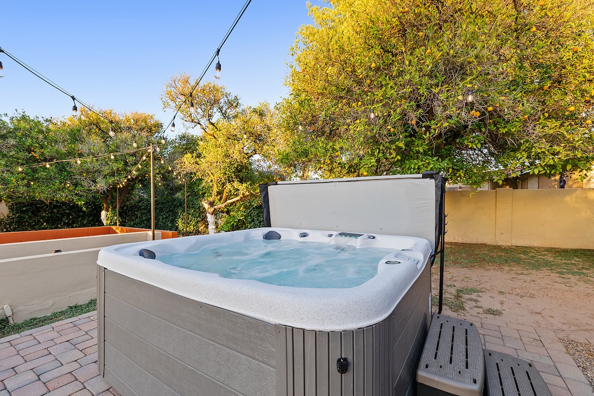 Heated pool, 8 seat hot tub, outdoor fireplace, and lots of patios to relax. The outdoor kitchen has a pizza oven, bbq, hot water sink, gas stove and oven, smoker and is a perfect place to enjoy. This place is close to restaurants, hiking, lakes and evening fun. Lots of trees: orange, grapefruit, key limes, lemons, pomegranate, figs, dates, grapes and there is a juicer for morning fresh juices. Safe, quiet, and has many hummingbirds and two giant (50 & 80 pound) tortoises.