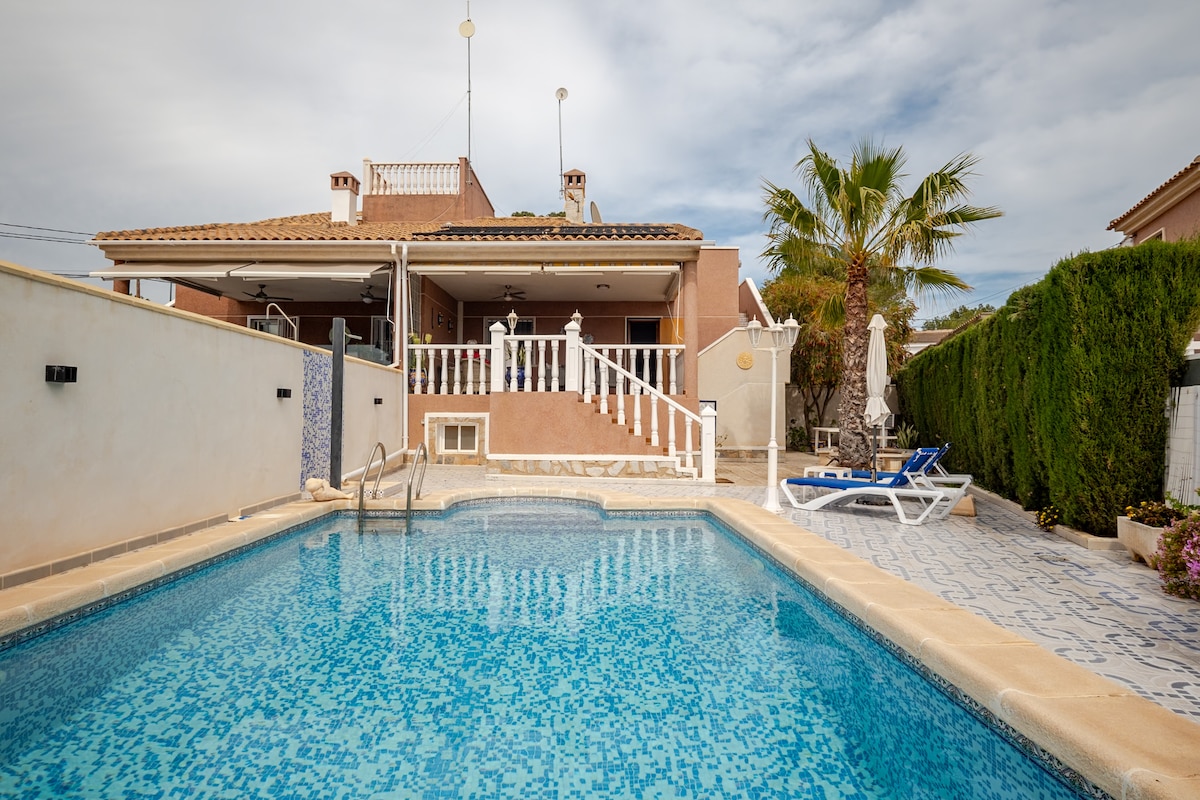 Tourist license number: CV-VUT0515922-A National Registry Number: ESFCTU000003050002413680000000000000CV-VUT0515922-A7 Quite rare in the area, a spacious villa with a swimming pool, views of the Mediterranean Sea, comfortable rooms, and a sunny terrace for outdoor dining. Very nicely decorated, this villa is located in a residential area, close to all amenities, on foot or by bike: supermarkets, bars, restaurants, golf, village center