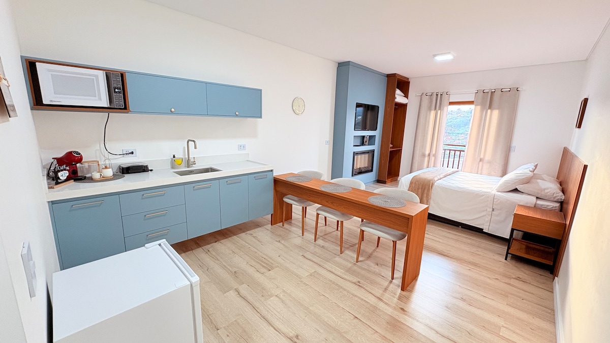 Comfortable en-suite/studio, 28 m2, with separate entrance to the house and a beautiful view. Spacious, comfortably accommodates up to 4 people. It has the infrastructure for preparing small meals. Bed and bath linens, as well as blankets and comforters, perfectly sanitized. High-speed fiber optic internet. TV with 80 channels. Located in Alto do Capivari, about 2.5 km from the tourist center. Easy access, with only 600 meters on a dirt road, leaving the asphalt.