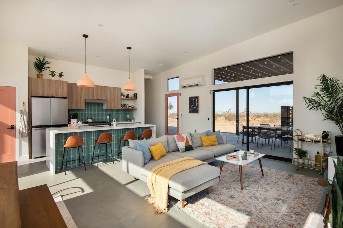 Sage Moon By The Cohost Company-- A Modern Scandinavian Home. Green like the Joshua Trees at Daytime and Black like the Starry Sky at Nightfall. Immerse yourself in the cozy modern interiors with close friends while feeling within nature of the surrounding desert landscape. Open up the sliding doors to your outside oasis including a hot tub, cowboy pool, bocci ball, fire pit, outdoor dining and more. Unwind, relax and spend quality time amidst the serenity of your very own Pioneertown retreat