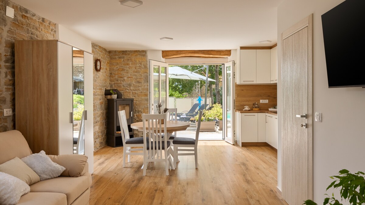 NEW - heated pool! Small, cosy and secluded house located in the village of Kranceti (1 kilometre from Motovun), suitable for four people. The house it's perfect for couples, families, and individuals who seek soothing, healthy and active experience. There is a private swimming pool with a stunning view of Motovun and an outdoor table and chairs, perfect for breakfasts or romantic dinners.