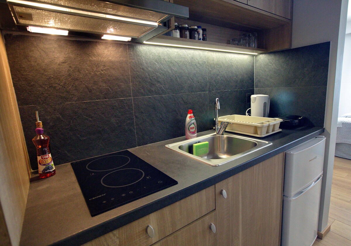 A modern, fully equipped semi-basement apartment of 40 sq.m. in Agia Kyriaki, Nafplio. A single living room and kitchen area with air conditioning, TV, a double sofa bed and an armchair that easily converts into a single bed. A bedroom with a large double bed, air conditioning and TV. Suitable for 5 people (family). Private parking, outdoor area, barbecue. 5 minutes from the center of Nafplio by car.