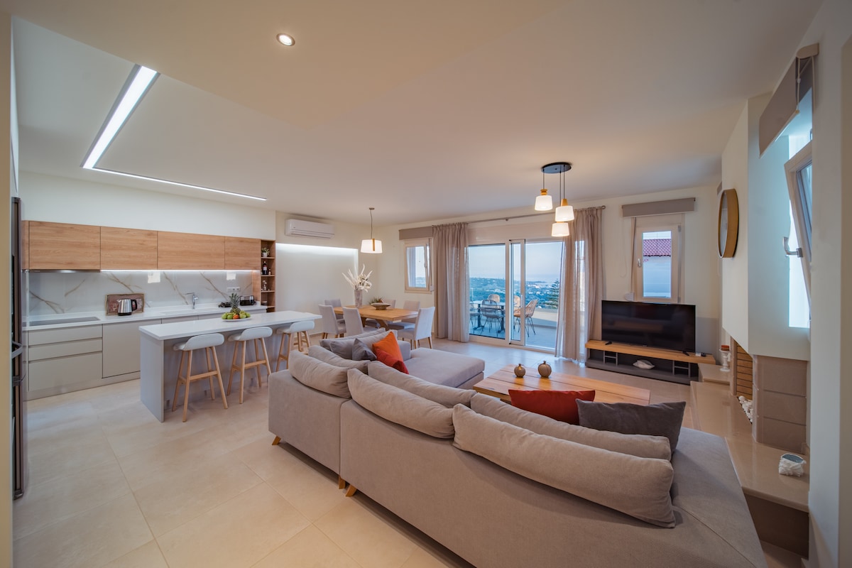 One of the most unique properties in Hersonissos. This magnificent residence, located in the center of the town has everything you need when traveling to Crete: Beach Front Access, high-speed internet access, smart Tv’s, Netflix, kids friendly facilities. There are 4 bedrooms professionally designed for comfort & relaxation, 2 bathrooms, fully equipped kitchen, spacious living room and a work station making it perfect for families or friends coming to enjoy Hersonissos like a local.