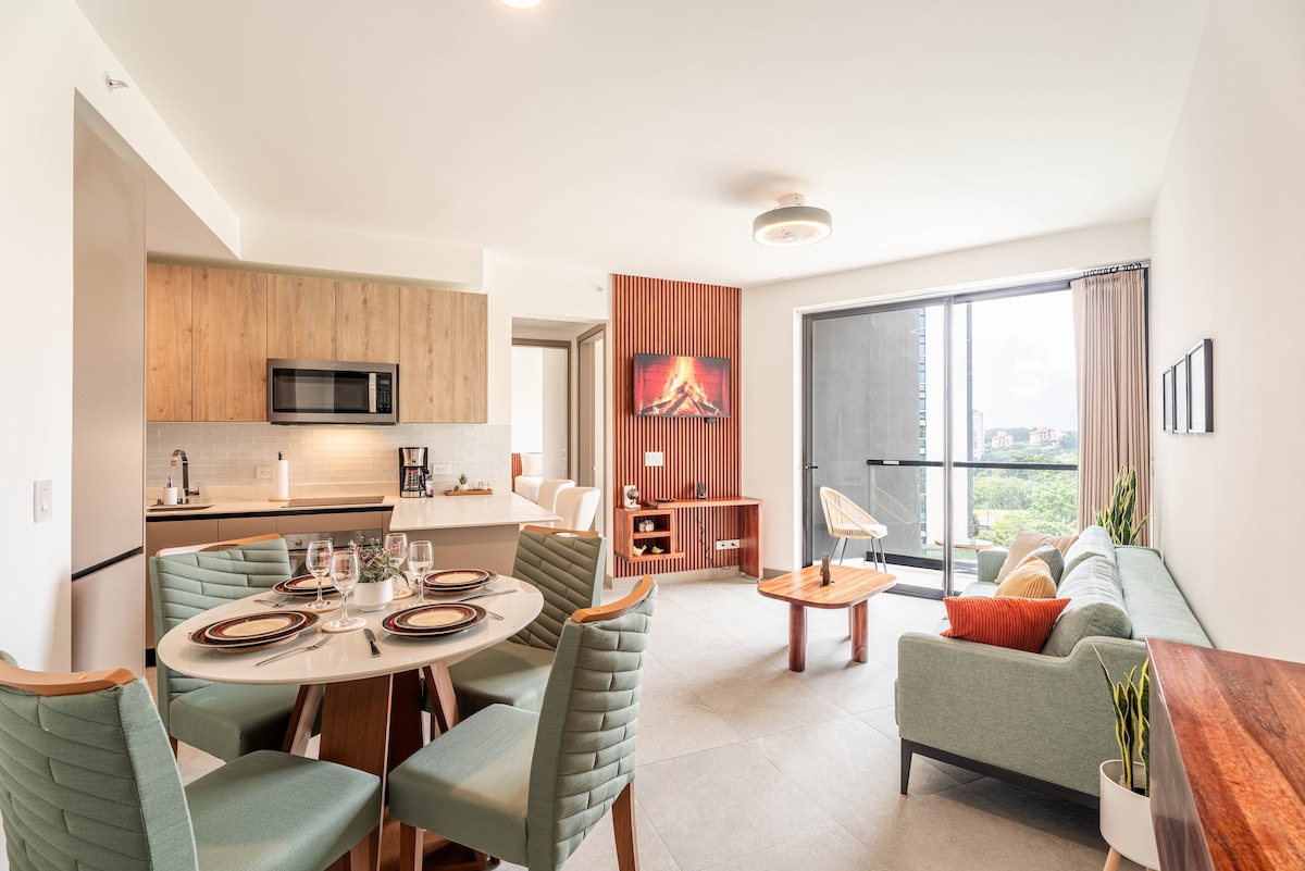 Enjoy luxury and nature in this stylish 2BR, 2BA apartment in Sabana. AC & private parking included. 16 minutes from international airport. Wake up to river views and greenery while enjoying over 30 top-tier amenities: rooftop, swimming pool, gym, cinema, coworking, soccer field, and a vibrant food zone. Sleeps up to 5. Located in one of San José’s most dynamic areas, just minutes from La Sabana Park. Ideal for relaxing or remote work in a premium natural setting. Full equipped