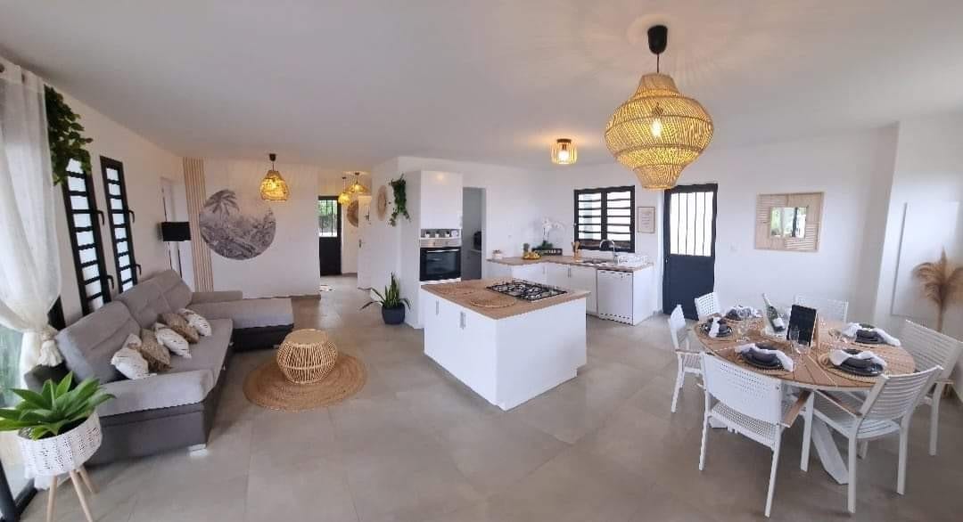 The Ti'Kaz Ocean villa is nestled in the heart of nature, facing the cane fields and the ocean. Ideal for vacations for families or groups of friends, it consists of two independent apartments. Ground floor: 2 bedrooms with bathroom, 1 sofa bed, a living room and a fitted kitchen. Upstairs: 1 bedroom, 1 sofa bed, bathroom and a terrace with sea view. Enjoy a swimming pool facing the ocean and sugarcane fields. A unique place to admire the sunsets.