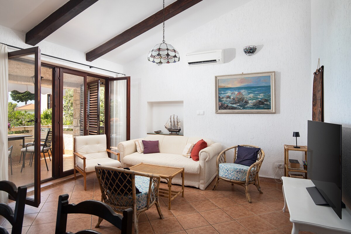 Apartment Manuel is on the top of the house with a sea view. It is only 400 meters from the sea. It is modernly equipped and spacious. You can park your car in front of the apartment. There are many palm trees around the apartment, in the yard of the house. Behind the house, there is a fireplace where you can grill and enjoy nature. The apartment is equipped with air conditioning, a washing machine and a dishwasher. It has a hairdryer, ironing board and iron.
