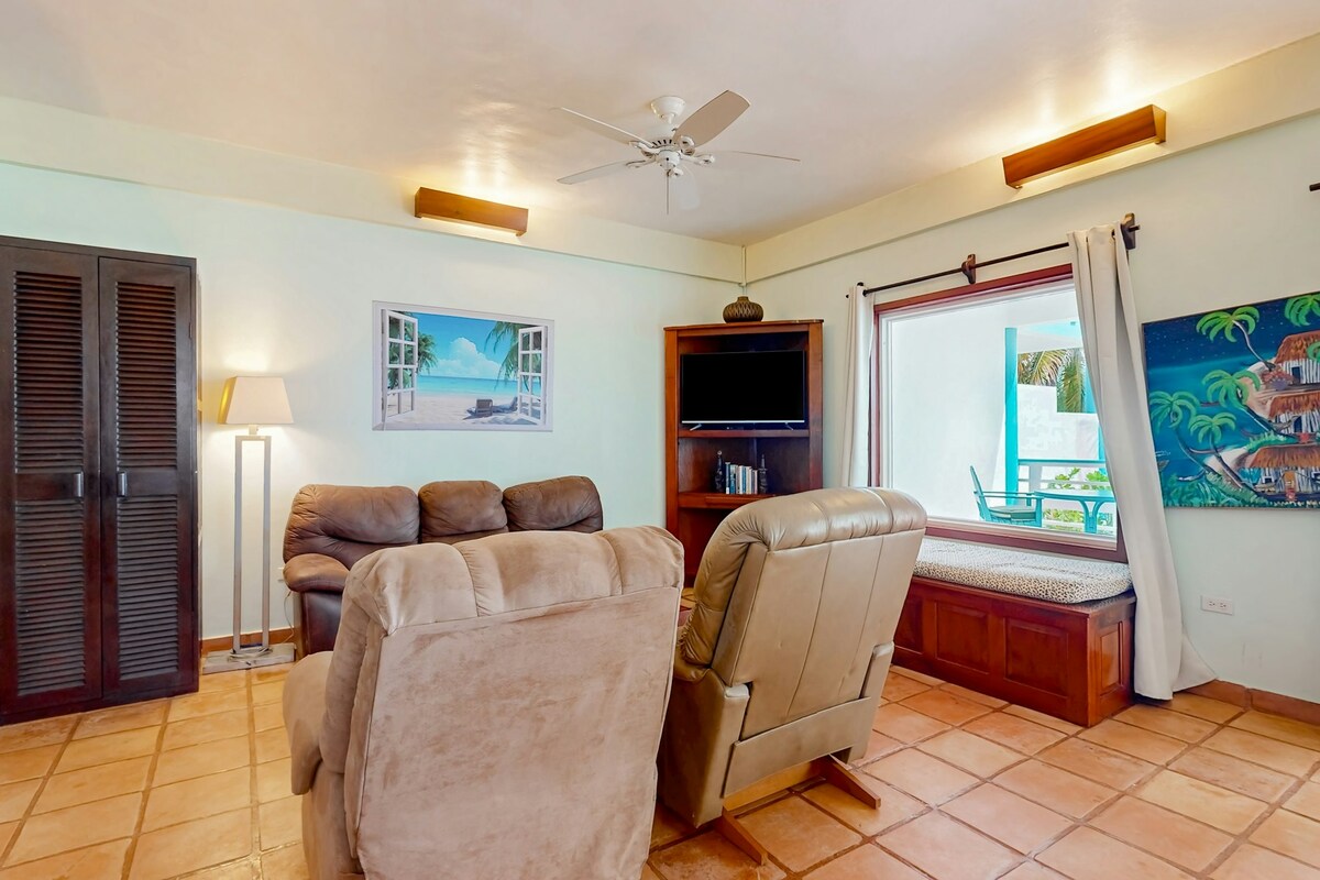 Perfect for large families! This 3-bedroom, 2-bathroom condo (Sleeps 8) offers uninterrupted Caribbean Sea views from its elevated second-floor balcony. Located on the beach, it provides a full kitchen and easy access to the shared resort pool and dock via a building lift (6 steps required to access the lift). The extra capacity is best used for children.