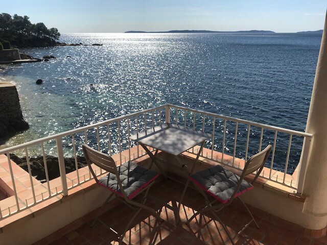 PRIVATE BEACH ACCESS Exceptional location, air-conditioned apartment overlooking the sea and islands, a view that you don't get tired of and that offers new breathtaking views every day. Very bright equipped kitchen with indoor/outdoor effect ideal for summer meals, living room with high quality rapido sofa bed (160 cm), double bed room (140 cm), large fully equipped terrace. Aiguebelle Beach, restaurants 2 min walk.