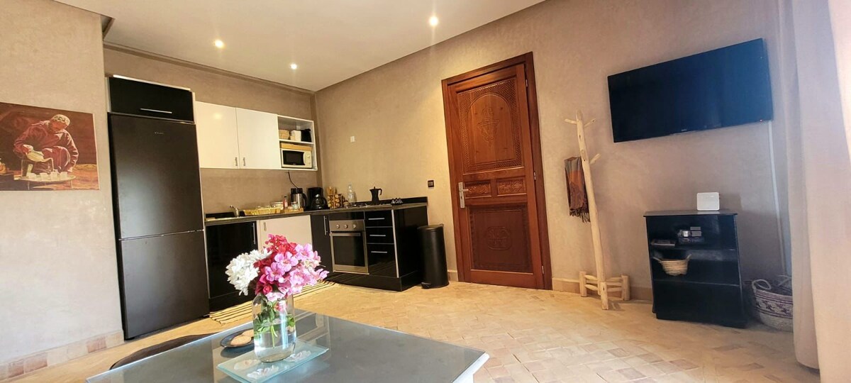 eschreibung [Fortsetzung] Unser Haus ist ein Riad mit einem schönen Innenhof und einer herrlichen Terrasse mit Grill. Die Terrasse oben bietet drei verschiedene Sitzgelegenheiten und unten innenhof zusätzlich eine traditionelle Sitzgruppe. Im Erdgeschoss befinden sich folgende Zimmer: Eine Küche , ein Schlafzimmer mit einem Doppelbett für 2 Personen , ein Wohnzimmer mit Schlafgelegenheiten für 2 Personen sowie ein Badezimmer mit Dusche und der herrliche Innenhof.