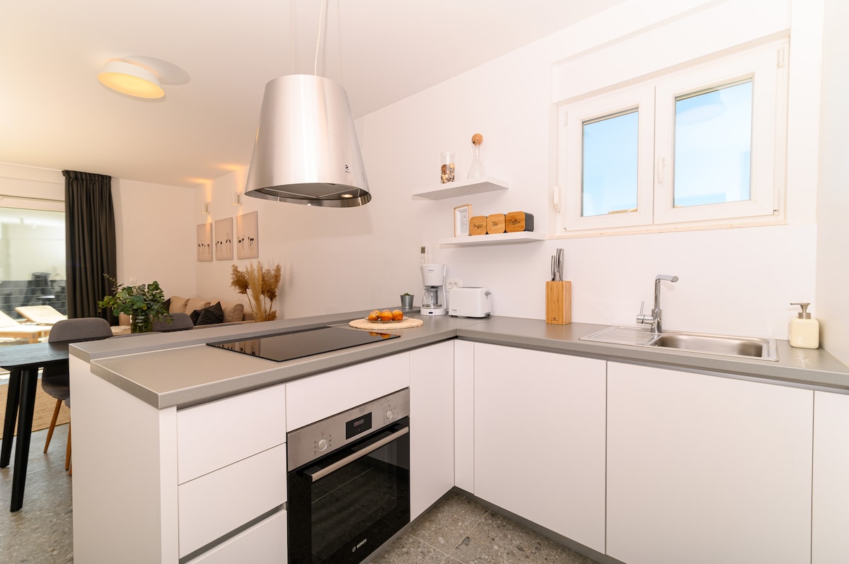 Welcome to Family Harmony, a comfortable apartment for up to 5 guests, located in the peaceful village of Plano, close to Split and Trogir. The apartment features two bedrooms, a bright living area, a fully equipped kitchen, and a modern bathroom. Guests can relax in the 12.5 m heated pool (approx. 26°C) with back massage jets, a central geyser, and lounge chairs with air massage. A separate children’s pool (22 cm depth) is also available, making it perfect for families.