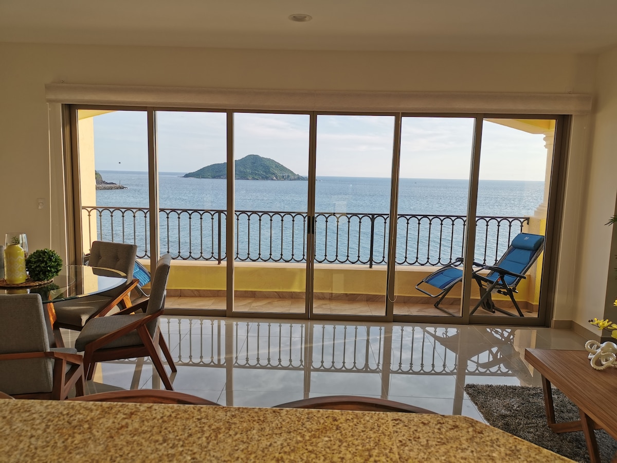 A Guest Favorite for Best Views in Town, centrally located on the Beach Front, among the most sought after Condos in Mazatlan, with an impeccable seven year rental history. Corner Suite on the 14th Floor, Amazing Panoramic Views of Ocean, Beach and City. Walk down to the Sandy Beach, Malecon Boardwalk and Restaurants. Starbucks, OXXO convenience store and Pizza Hut located on the first floor. Pool, Gym, Parking and 24/7 Security... An Absolutely Impressive Beach Front Condo Experience.
