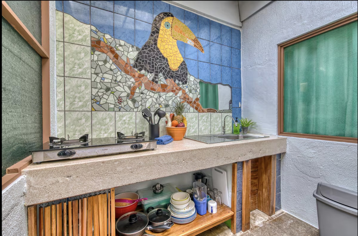 Charming tropical villa with a private pool, AC, and fast Wi-Fi. Located in Cocles, south of Puerto Viejo, it’s clean, secure, and surrounded by lush trees, bamboo, and a small creek. The beach is 900m away (5 min drive, 15 min walk). Close to restaurants, shops, motorbike,bici,quads rental, pharmacy and supermarkets. Perfect for relaxing and watching local wildlife.