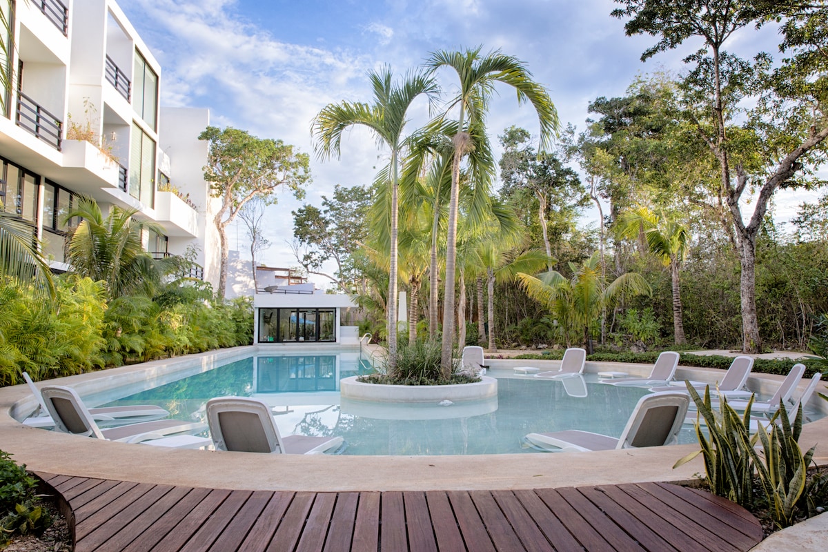 Tu oasis privado en el Exclusivo Bahia Principe, imagina, despierta rodeado de la selva maya, abrir la puerta de tu terraza y estar a solo pasos de una alberca cristalina. Bienvenido a tu refugio en uno de los complejos más exclusivos de la Riviera maya. Este hogar es increible. Esta en una zona super tranquila donde puedes conectar con la naturaleza. La playa a solo 5 minutos en auto , con transporte interno gratuito disponible. Acceso controlado con código QR, solo para residentes y huespedes