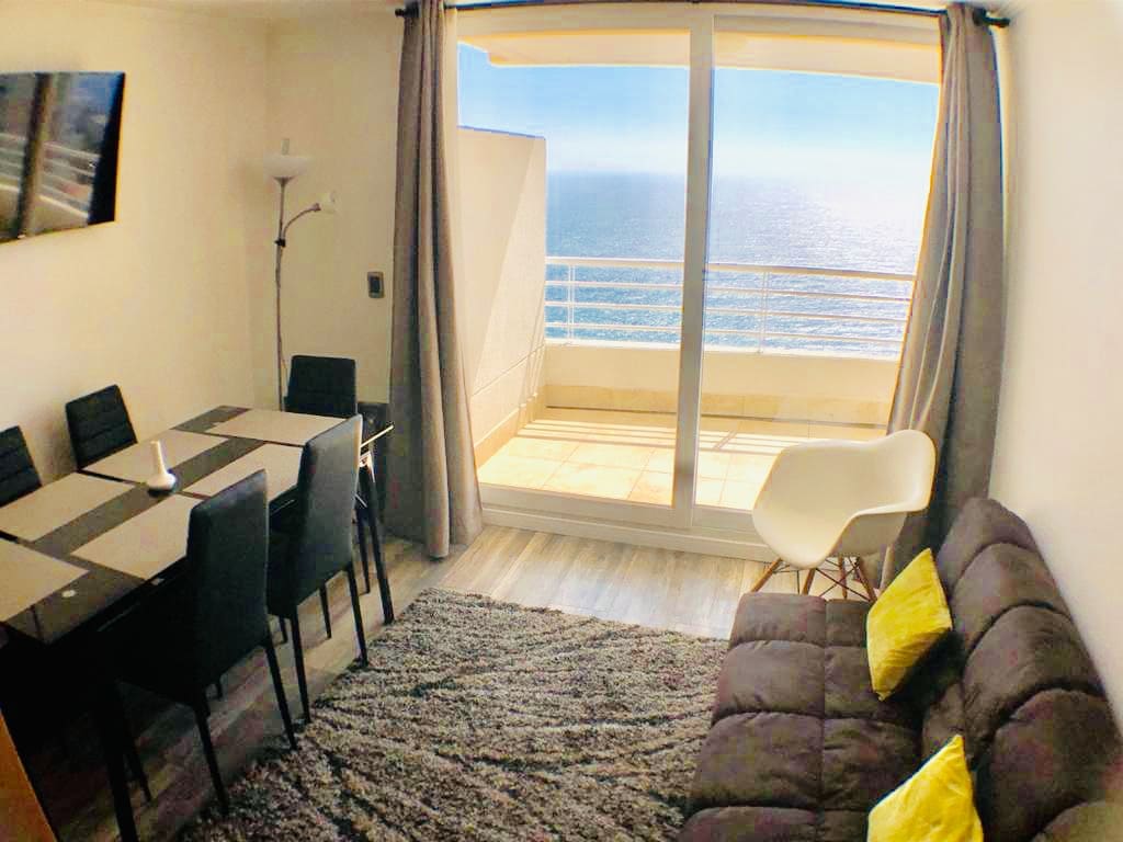 New apartment located in an exclusive neighborhood of Con con, Costa de Montemar. The apartment is furnished and fully equipped with internet access, a swimming pool, a gym, a sauna for rent, private parking, and a spectacular panoramic view. There is a supermarket and shops less than five minutes away and it is 100 meters from the Con Con dunes, ideal for two to three people, which is perfect for entertainment and rest.