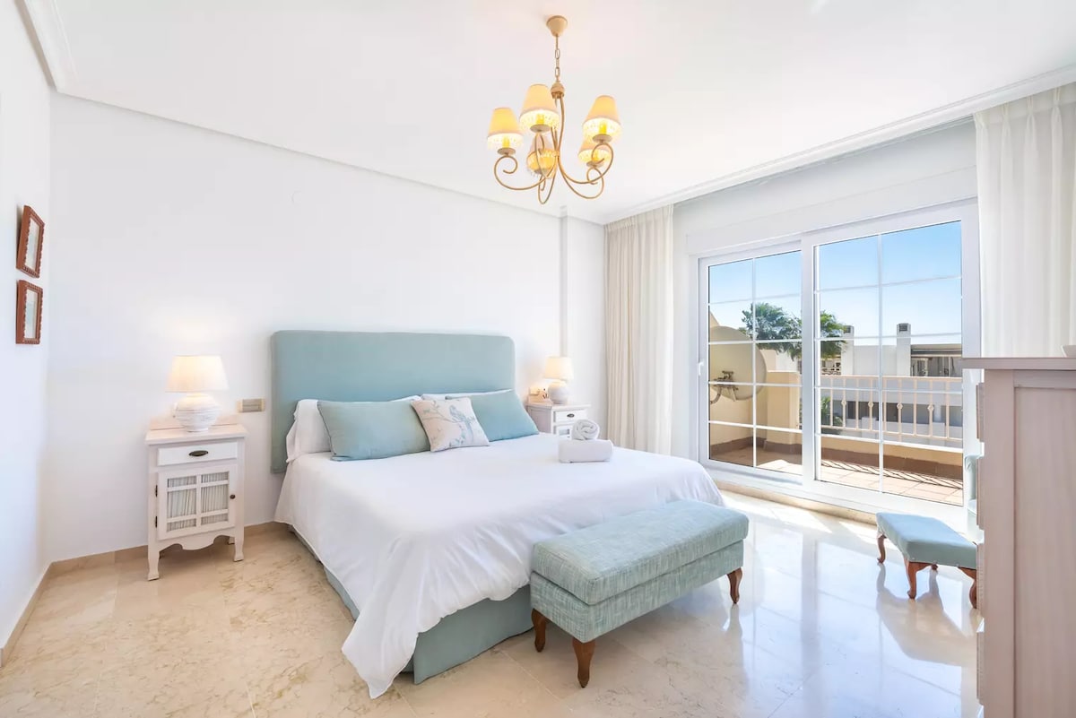 Among the Top 1% of Airbnbs worldwide! Designer-curated 1-bedroom corner penthouse in Andalusian style, featuring the finest materials and meticulous attention to detail. Experience exceptional cleanliness with crisp percale cotton linens. This suite rivals a 5-star boutique hotel room - but with a fully equipped kitchen and a private terrace. Located in an exclusive urbanization on Marbella’s Golden Mile - Sierra Blanca, ideally positioned between Old Town & Puerto Banús, above Puente Romano.