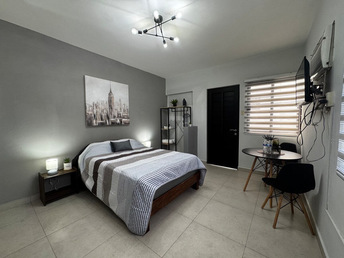 Deep cleaning before each reservation and disinfected with a COFEPRIS-certified product. Antibacterial gel dispensers in common areas. A warm and cozy space, with services for long stays and to make you feel at home. It has a double bed, its own bathroom, air conditioning, closet, kitchen equipped with coffee maker, electric grill, refrigerator, dishes, microwave and iron. WE DO NOT HAVE PARKING
