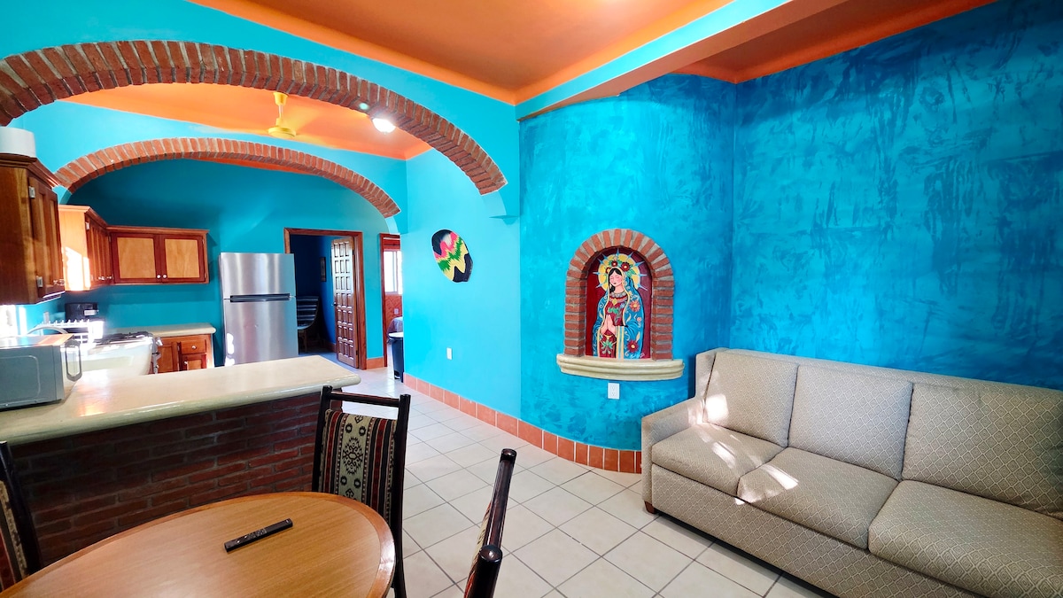 Casita Angela is tastefully decorated with textiles, pottery & Mexican Folk Art. It has a private bathroom and terrace. It has a full size kitchen for your use that you share with 1 other casita, plenty of space for all. The pool and grill kitchen are shared spaces. There is no smoking allowed anywhere on the property. Kids are only allowed when you are renting the entire 5 bedroom house known as Casita Cielo Azul. Here is the link for the entire house. airbnb.com/h/villa-casita-cielo-azul