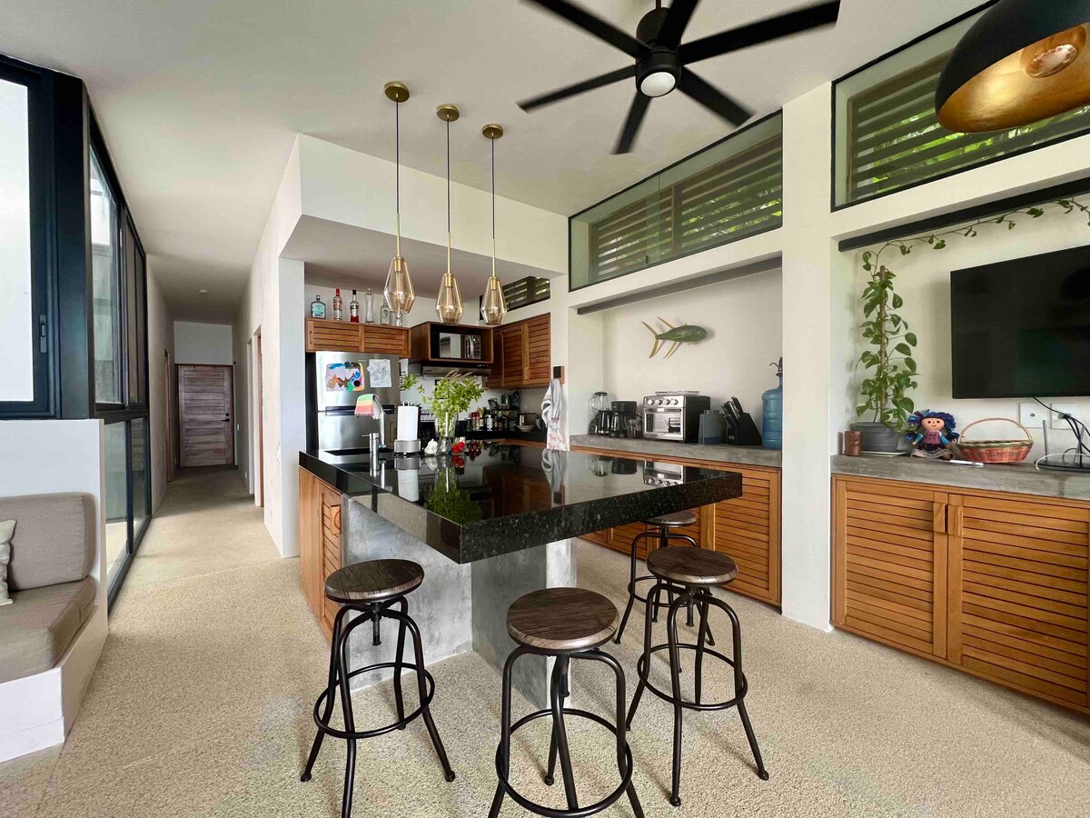 This luxurious, 1-bedroom apartment is located in the quiet residential neighborhood of La Barra, only a 5 minute walk to one of Puerto Escondido's most beautiful and secluded beaches. Away from the crowds and the noise, you get to enjoy your stay in peace and quiet, while the bustling restaurants and nightlife of La Punta and Zicatela are less than a 10 minute drive away.