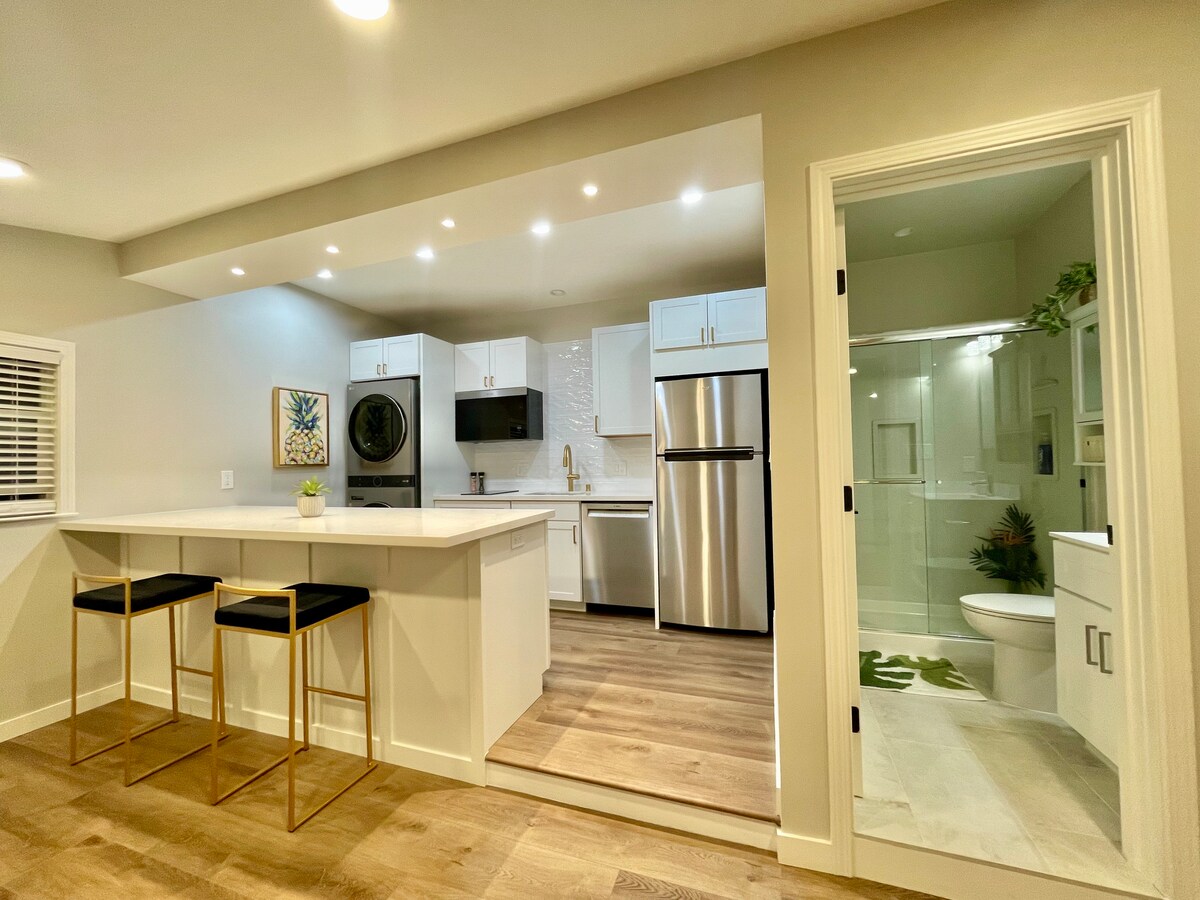 If you're searching for one of the premier Airbnbs in Walnut Creek, your search ends here! From the moment you arrive, you'll notice the attention to detail and exceptional value of this 2-bedroom, 1-bathroom home. It comes fully equipped for a first class experience. What truly sets this guesthouse apart is the wrap-around covered porch, featuring three ceiling fans, accent lighting, a gas BBQ, a fire table, a dining table adorned with a chandelier, as well as rocking and Adirondack chairs.