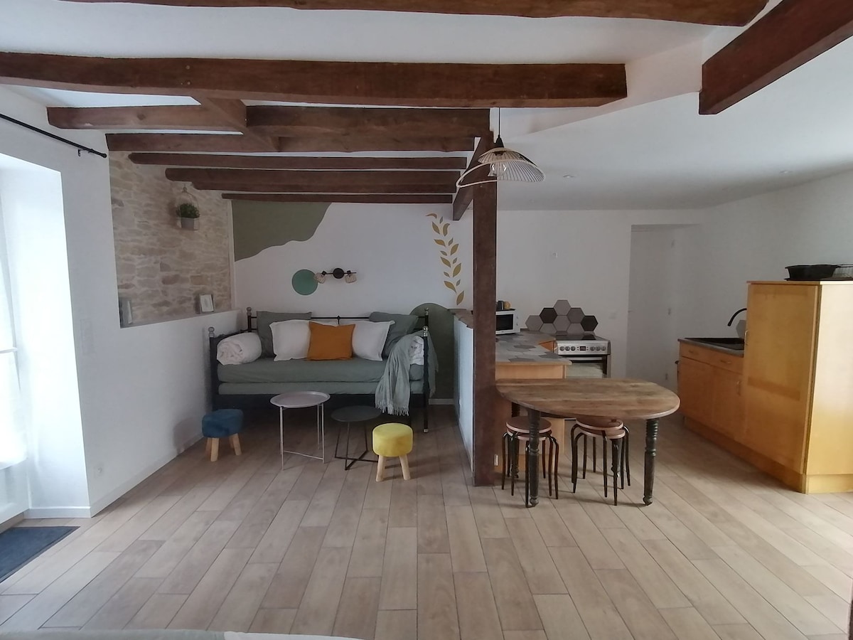 At the heart of our organic vegetable farm, in the countryside, on the ground floor of a stone farmhouse that we are finishing renovating, we are offering this studio for rent. Furnished with a double bed and a sofa bed for two, it has its own kitchen and shower room. You can also enjoy our large garden with games for children and, when the weather permits, our outdoor pool.