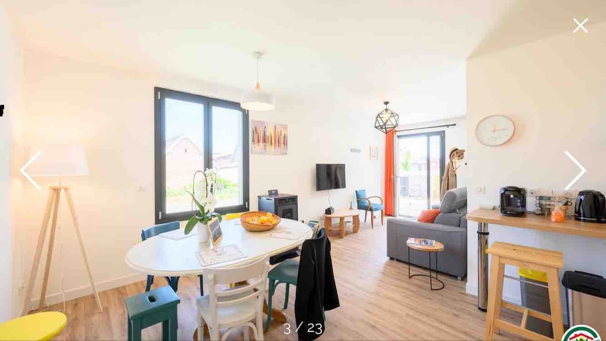 Quality wooden frame cottage, new, triple glazing. Nestled in the countryside, close to Noyon and Roye (10 min). This vacation rental is composed of 2 bedrooms, 1 bathroom with Italian shower, a fully equipped kitchen open to the dining room and the living room with a pellet stove. 1 terrace, 1 garden, 2 parking spaces for car and van. Decorated with vintage and Scandinavian objects, you will feel good there! The gîte has a petanque court and a basketball hoop.