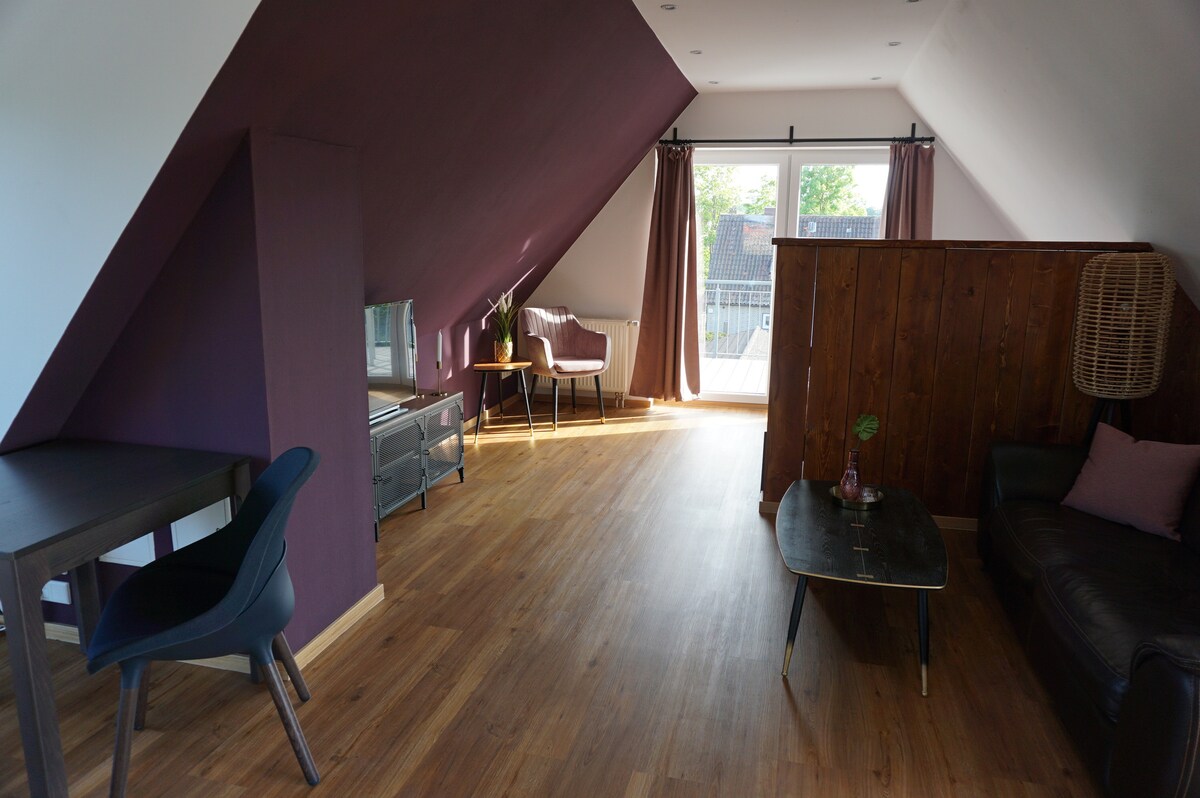 Cozy, beautiful, bright attic apartment, 2 single beds 1.00 x 2.00 m or pushed together as a double bed (200 x 200), as well as a single bed (100 x 200) in the separate adjoining room (also dressing room). If more guests are added, it is possible to fold out a folding mattress for the floor; small fully equipped pantry kitchen, great bathtub and shower, TV, telephone and Wi-Fi Private parking is available right outside the front door.
