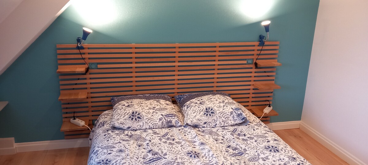 Our 2 bedrooms are located 1.6 km from Gwin Zégal, GR34, Route des Falaises and 1.8 km from Plouha city center. The first bedroom has an ensuite bathroom (shower + bathtub) and private toilet. It is equipped with 1 king size waterbed, satellite TV and a wardrobe. The second is accessible by a corridor and has a 140 x 200 bed and a closet. Extra charge of €25 per guest for a 3 rd and 4 th person Breakfast included.