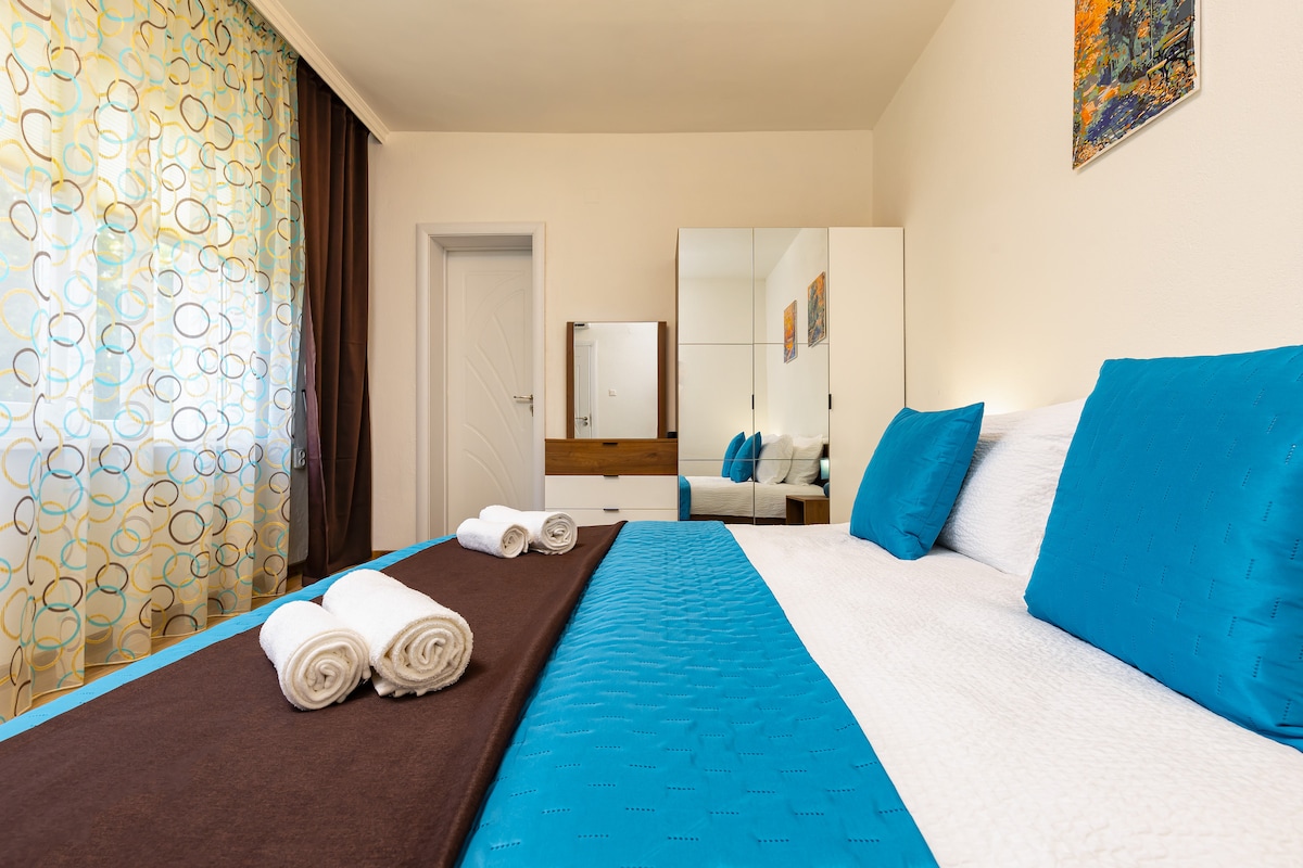 Centrally located one bedroom apartment. 10 min walk to: • Central bus & train station • All major tourist sites • Markovo Tepe Mall • Sila Sport Complex • Gyms and grocery stores Early check-in at 10:00 a.m. Late check-out at 13:00 p.m. Fully equipped kitchen for longer stays. For up to 3 persons • Bedroom - 1 king size bed (180/200cm) • Living room - 1 couch (190/90) • Fully equipped kitchen • Bathroom • Laundry and storage room Paid parking available on site.