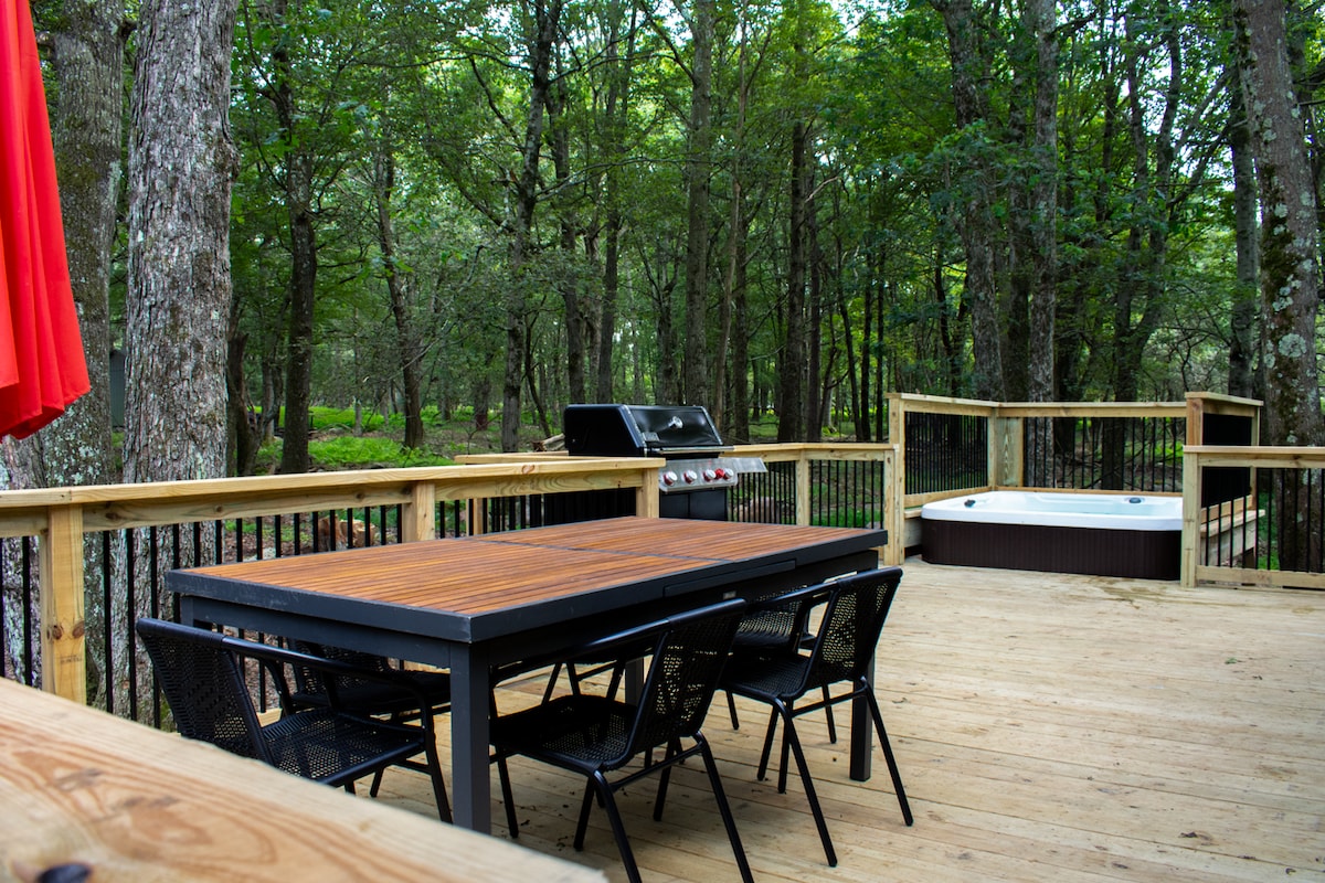 Immerse yourselves in the perfect blend of serenity and romance at our fully renovated Poconos log cabin. It offers a private feel, while located in a safe neighborhood. Cuddle up in our living room day bed while enjoying backyard forest views through the giant picture window. Relax in the hot tub or by the fire pit where memories are made! Centrally located, the cabin provides access to ski resorts and hiking trails. As guests, you'll also enjoy access to the lake, pool, and sports courts.