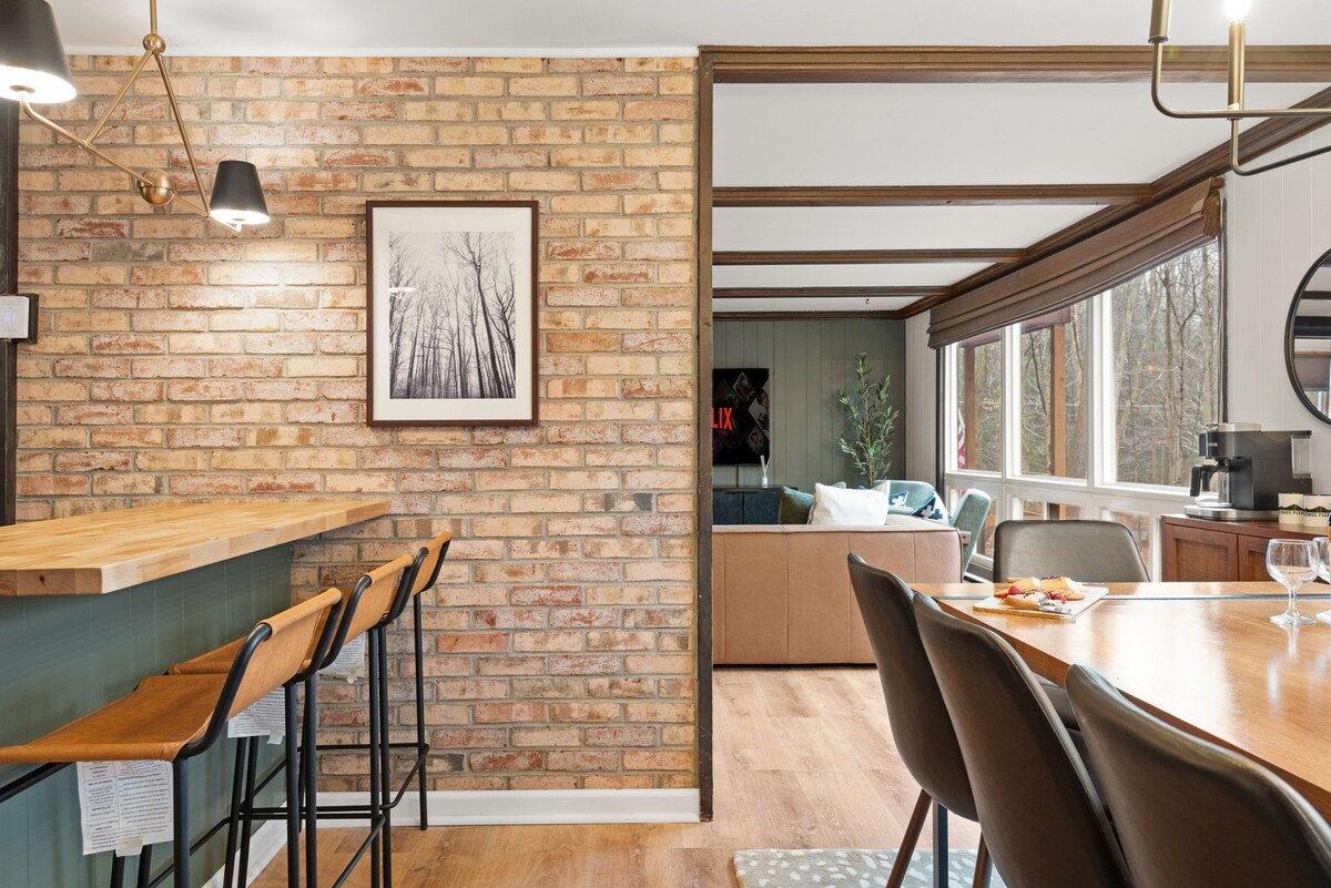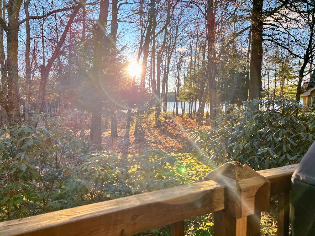 Just chill at our beautiful, remodeled cottage in the woods in the heart of the Poconos. The perfect place to relax with family and friends and connect with nature! We're just a short walk to North Beach of Lovely Lake Naomi. This home boasts comfortable beds, beautiful wood floors, newly remodeled bathrooms, fully equipped Kitchen, Dining room, Gas Fireplace, 2 decks, Gas Grill, Fire Table + Fire Pit. Centrally located in a quiet pocket in the heart of Poconos, adventures at your fingertips.