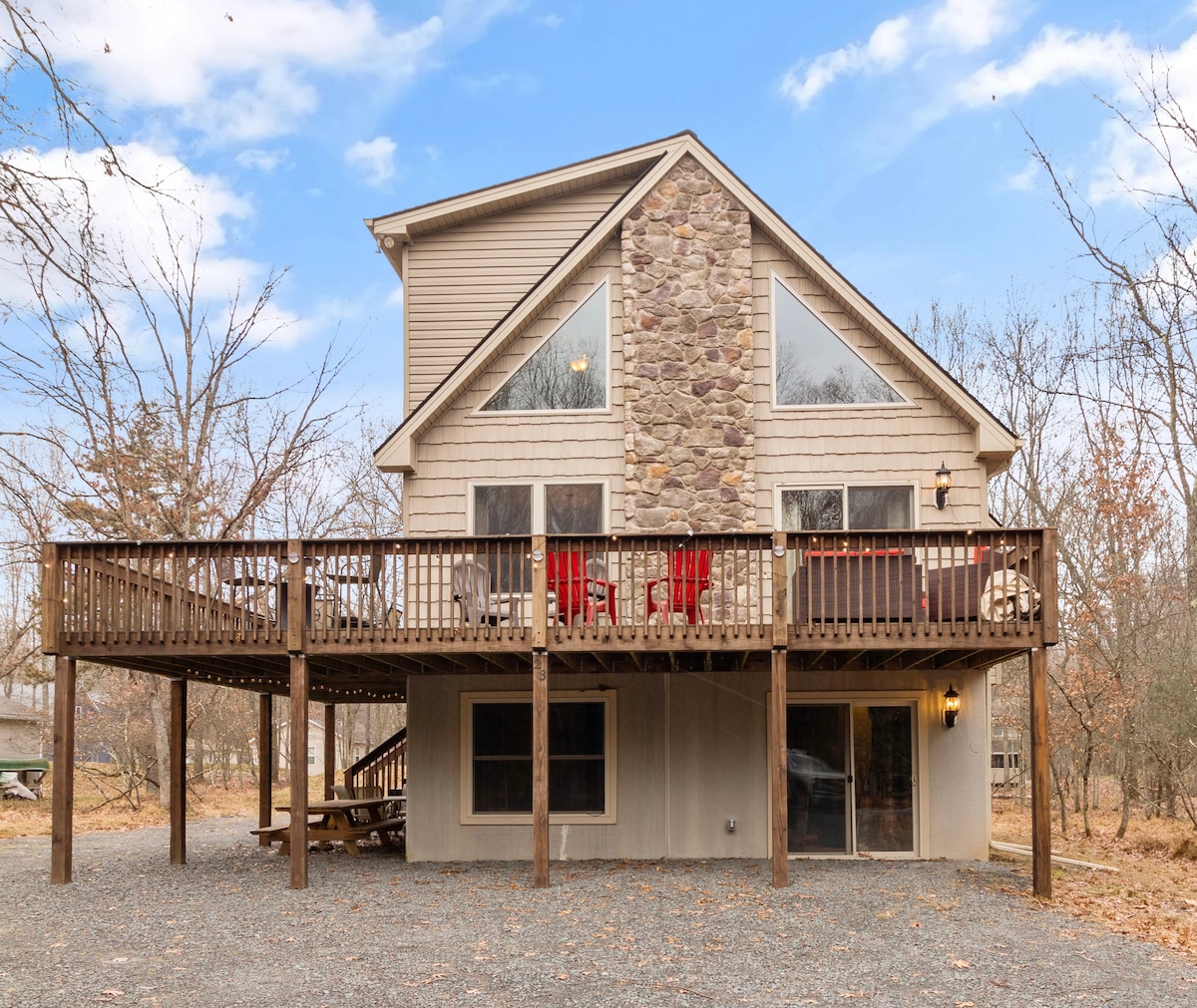 A stunning chalet ideally situated in the Pocono mountains. Your destination for a weekend escape or a longer stay all year round! Outside one can enjoy a natural setting in a beautiful 1-acre private wooded property, hot tub, two fire pits, a deck for morning coffee, or a delicious BBQ. Our home offers a tranquil interior atmosphere and home is conveniently located near all Pocono Mountains' seasonal activities. Whether you want to unwind or recharge, our home provides the perfect retreat.