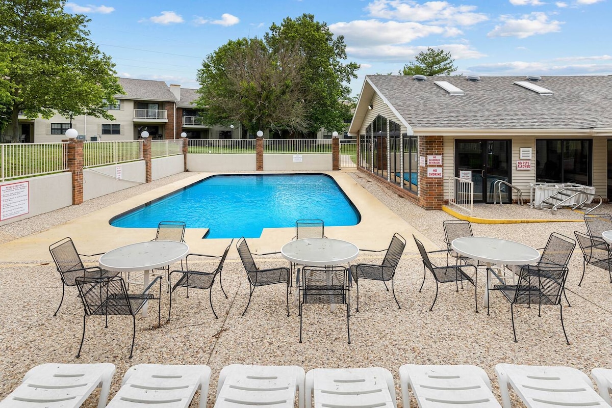 This recently updated Condo is 5 min from the strip, 15 min from Tablerock State Park and 15 min from Silver Dollar City. The master bedroom has a King bed and ensuite, bedroom 2 has a queen size bed and door to the main bathroom, there is also a sleeper sofa in the living room. We are right across from the club house where you can swim indoor or outdoor, enjoy the hot tub or sauna and get your sweat on with the exercise machines available. WE ALLOW UP TO TWO NON-SHEDDING DOGS UNDER 30 LBS.