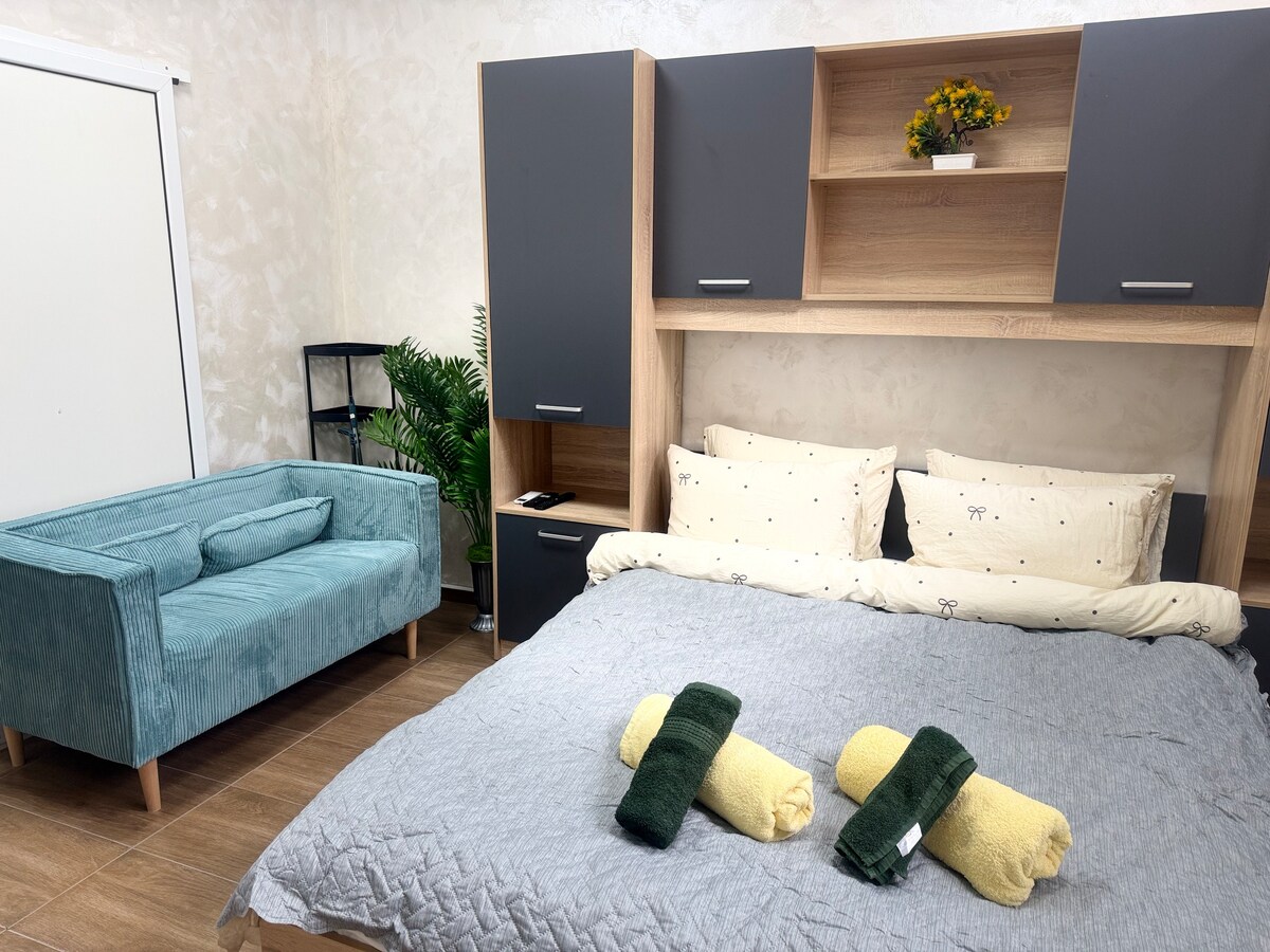 We present to your attention a cozy and luxurious apartment for guests, Devio Char, located in a quiet area at the beginning of the city. We offer our guests air-conditioned rooms with a balcony and free WI-FI, equipped with huge SMART TVs in each room. The apartment has two separate bedrooms, a spacious living room with a sofa bed and a fully equipped kitchen. The block has a large public parking lot. A compliment to each of our guests - a bottle of wine, mineral water, coffee, tea, fruit.