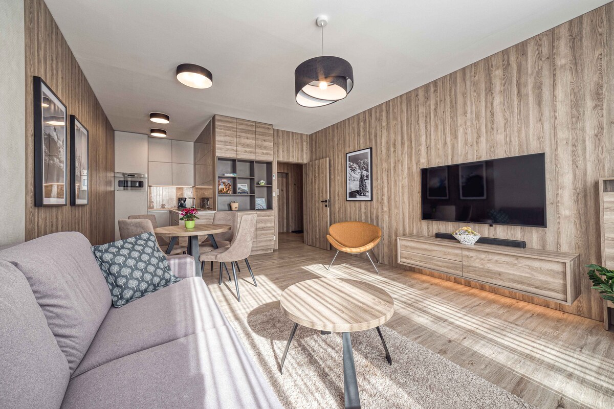 The TatryView by KingDubaj apartment with a view of the panorama of the High Tatras is located in a beautiful green environment in Veľká Lomnica. The modern mountain design facility will provide you with a great place to relax with your loved ones. Enjoy your morning Nespresso coffee with a view of Slovakia's landmark right in our apartment.