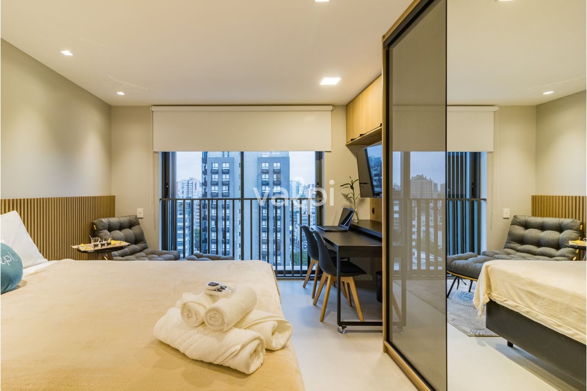 Very nice studio apartment. With internet, barbecue, 40-inch Smart TV, split air-conditioning, double box bed, sideboard and closets. Kitchen with electric cook top, fridge and microwave. Self-service laundry. Lounge and party room with barbecue. Fitness area and swimming pool. 24-hour camera surveillance. We have parking in the building itself, charged separately. Cost of only R$ 10.00 per day. There are 3 parking floors.