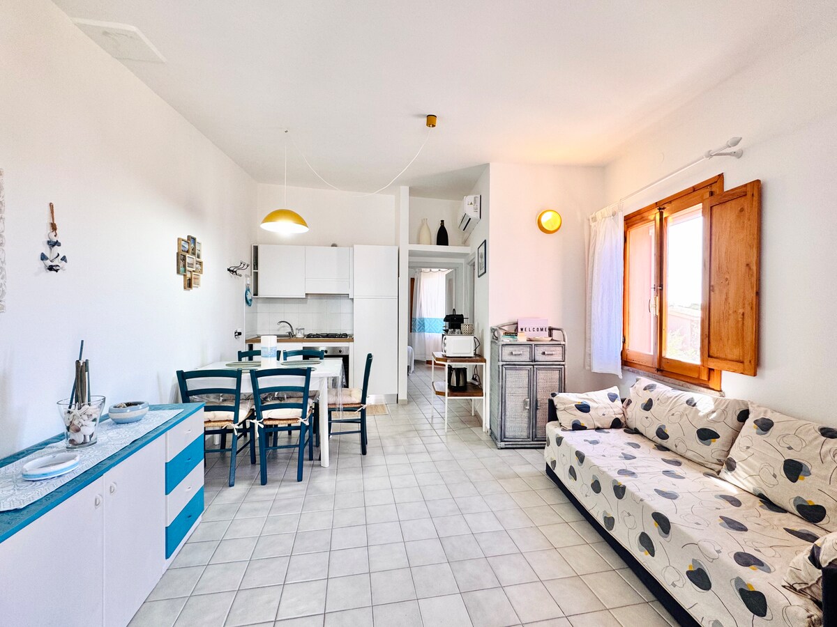 Posteggiate la macchina all'interno del villaggio e dimenticate di averla perché a 500 mt avrete la spiaggia La Cinta e, ad altrettanta distanza, il centro per le vostre allegre serate. L'appartamento si trova al primo piano ed è dotato di una confortevole veranda coperta ideale per pranzi e cene, un soggiorno con divano letto da una piazza e mezzo, tv, angolo cottura, camera da letto matrimoniale, armadio ripostiglio, bagno con doccia. No WI-FI