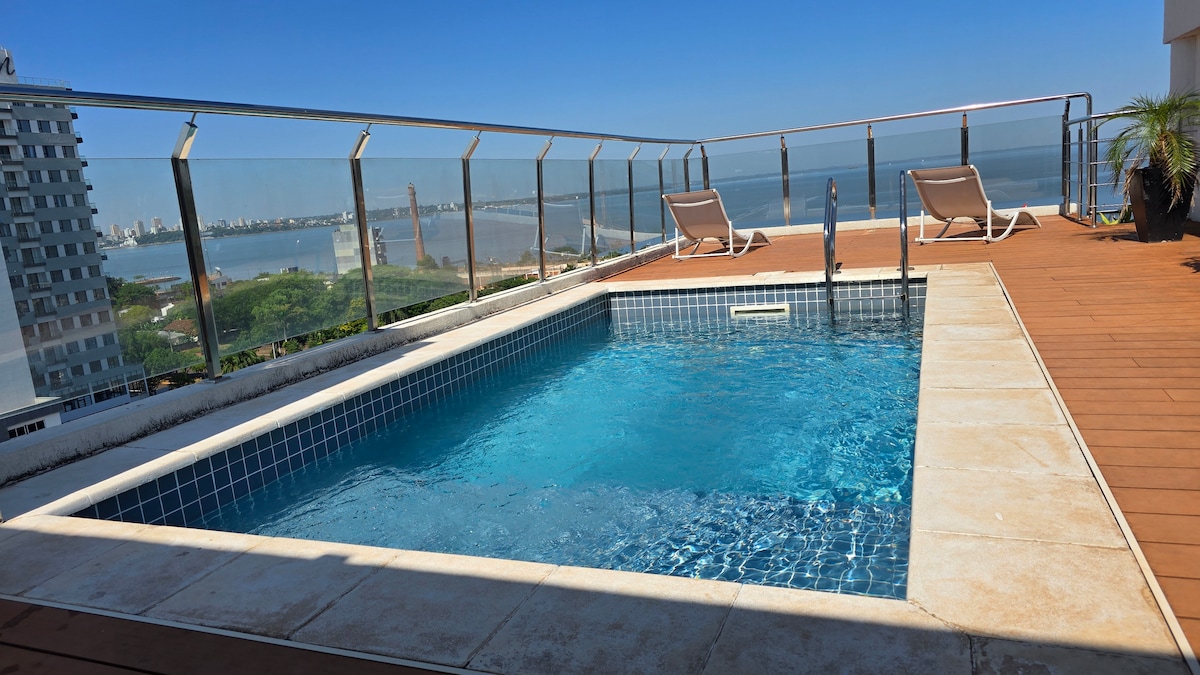 Despierta tus mejores energías con la espectacular vista panorámica de Posadas, el río Paraná y la ciudad de Encarnación, en este cálido, luminoso y confortable apartamento en el corazón de la ciudad, rodeado de tiendas, mercados y restaurantes. Ubicación inmejorable. Es un excelente punto de partida para visitar puntos turísticos y la maravillosa provincia de Misiones. Edificio con seguridad 24 hs. Internet de alta velocidad y todo lo necesario para una estadía completa, segura y placentera