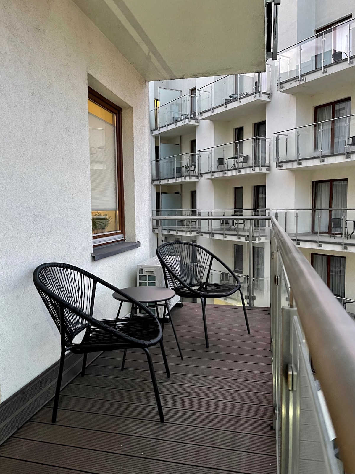 Original and functional Chicago apartment with a balcony and a view of the park and Stary Browar. The 32 m² space includes: – a separate, cozy sleeping area; – a living space for relaxation; – a fully equipped kitchenette with a dishwasher; – a bathroom with a shower; – an iron, ironing board, and washing machine available for guests in the common area. The apartment is located in a townhouse on the 3rd floor without an elevator – low steps, wide staircase.