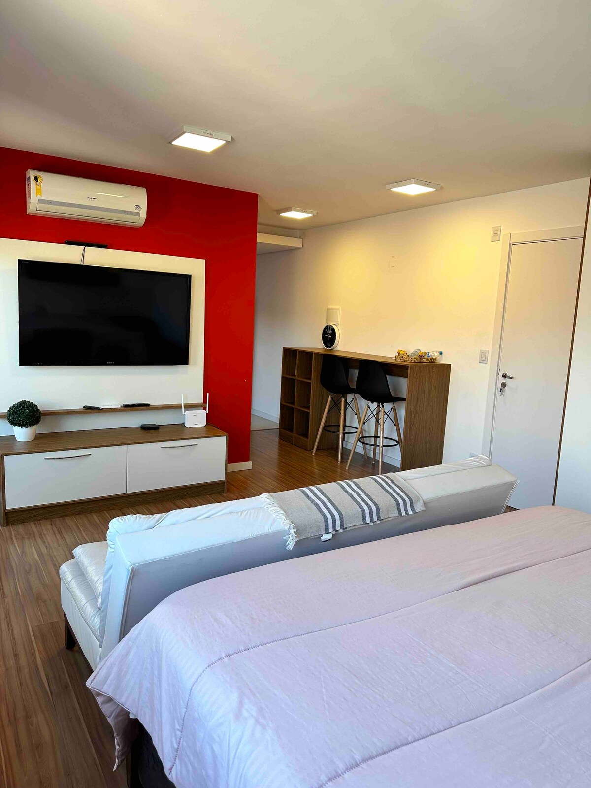 Welcome to Pelotas, an old city with many leisure options. The space is perfect for 2 people but accommodates up to 4. Fully furnished, you'll have everything you need for comfortable, quiet, and pleasant days in a clean, quiet, well-lit, and organized space. It has a hot/cold split in the room, Wi-Fi, 32" Smart TV, full kitchen with several appliances, bed and bath linens, hairdryer, electric towel warmer, armchair with massager.