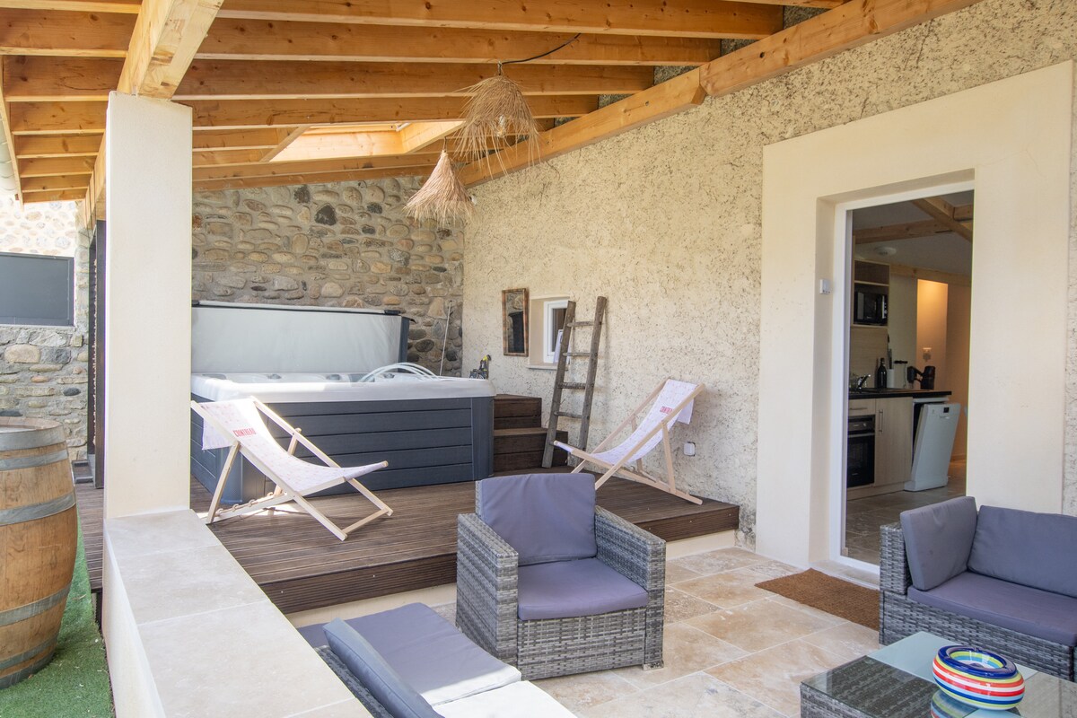 Le Splendid is a self-contained apartment with a high-end private 93-jet hot tub. This former barn renovated in a contemporary style where stone and design mix, will provide you with elegance and comfort. Ideally located in Saint-Étienne-des-Sorts in the Gard, a charming little village built on the banks of the Rhône. 20 km from La Roque-sur-Cèze and its Sautadet Waterfalls, 20 km from the Ardèche Gorges and the medieval village of Aigueze, 45 km from Vallon-Pont-d'Arc, 30 km from Avignon
