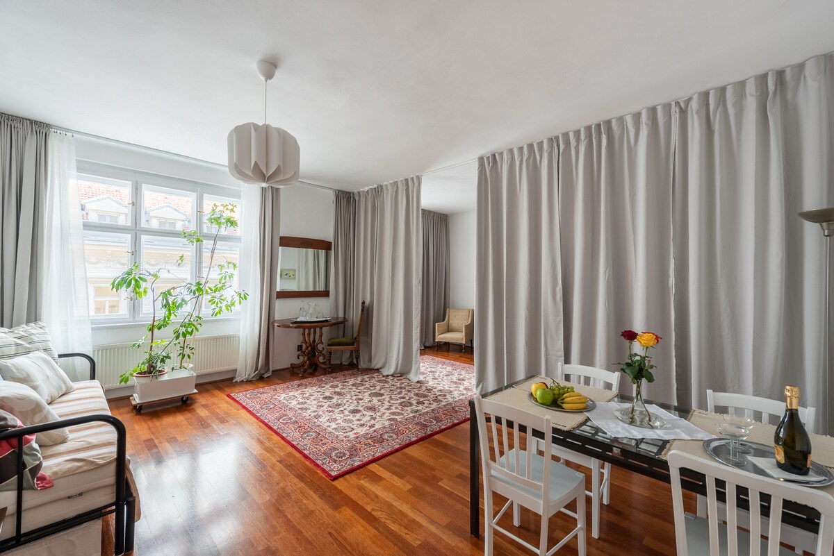 This enchanting and very spacious apartment (55 m2/600 sq ft) is just 1 stop from Wenceslas Square and 2 stops from Old Town Square/Astronomical Clock. The apartment is just after renovation and is partly equipped with antique furniture. There is also a fully equipped kitchen and a comfortable shower and toilet. High speed Wi-fi and Netlix included. Moreover everything is at hand - shops, sights, laundry and various types of services. Parking details presented below.