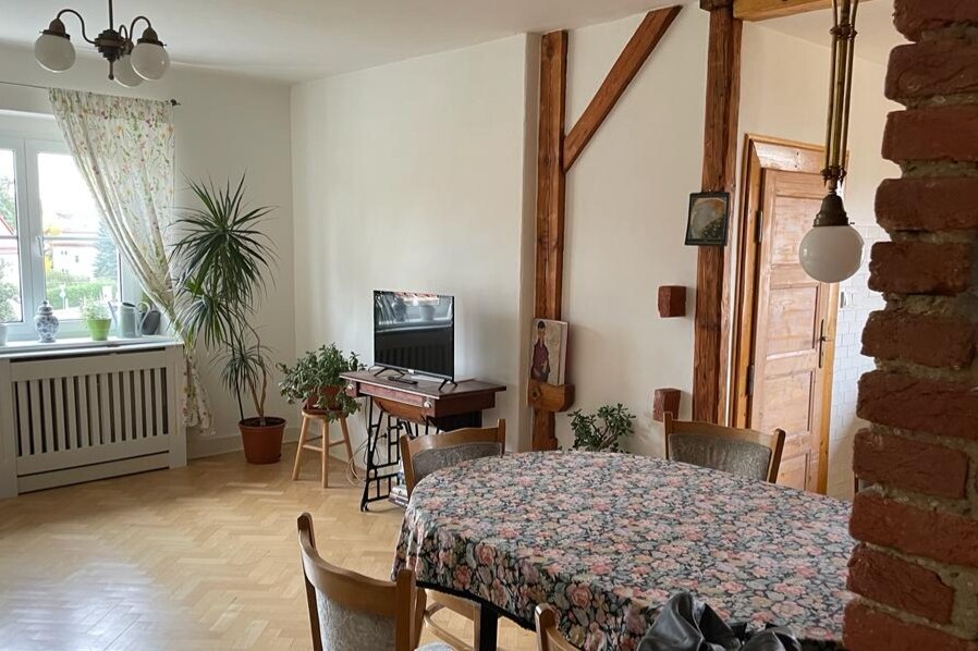 The 65 m2 apartment consists of two rooms with kitchen, bathroom and a balcony overlooking the park. It is located on the elevated ground floor of a newly renovated house. The kitchen is equipped with a refrigerator, dishwasher, stove with oven, electric kettle, microwave, and dishes. In the cleaning room, there is a washing machine, a second WC, an iron with a board and utensils. Visitors from all countries are welcomed.