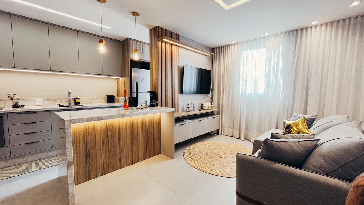 Complete apartment in the city center, close to markets, cinema, restaurants and shops. Less than 5 minutes from the sea! 😃 The apartment has a bedroom, living room, bathroom and kitchen/utility area, fully furnished and ready for use. In the living room, the apartment has a double-size sofa bed. Sea views from both the apartment and the terrace, which has a swimming pool, gym and leisure area. Also includes TV with Netflix and other streaming services (not included), barbecue and garage