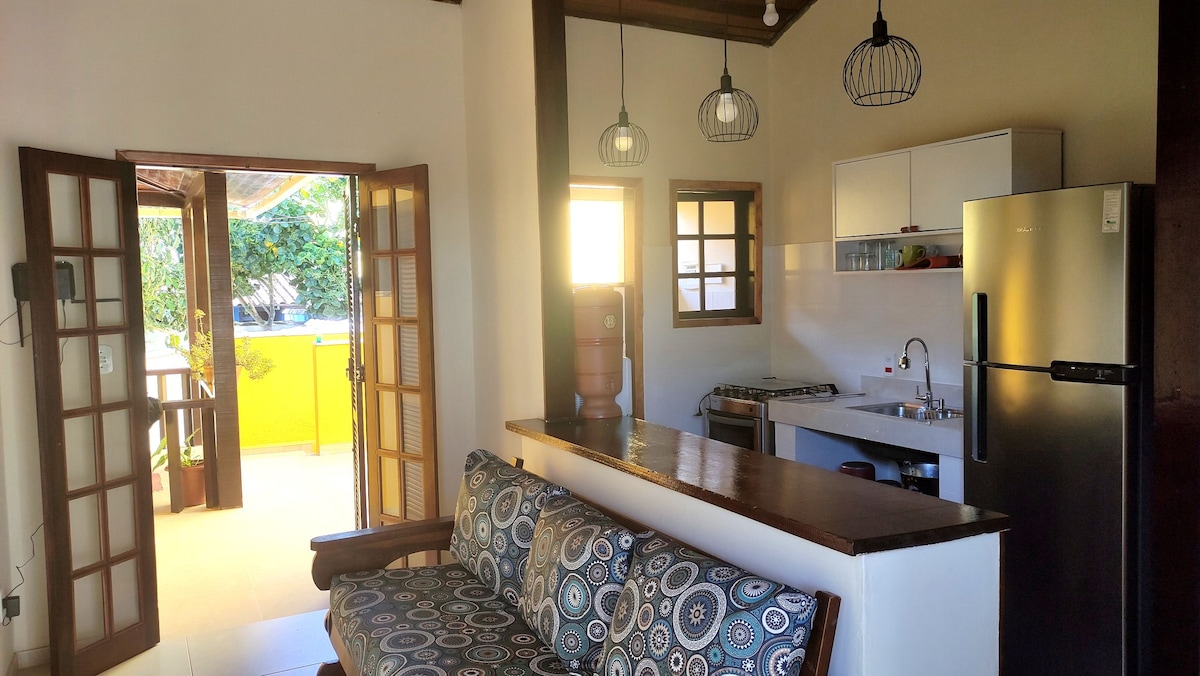 Renovated loft on two floors a few meters from Geriba and Ferradurinha beaches. First floor with bathroom, double bed, sofa bed, TV (netflix/cable ), full kitchen and AC. Second floor with bathroom, kitchen with sea view, living room with a single sofa bed, new AC and TV. Large open terrace with table to eat, garden and shower. All furnished and decorated with good taste. 7 minutes from Porto da Barra and 15 from rua das pedras, center of Buzios. Come and relax by the sea.